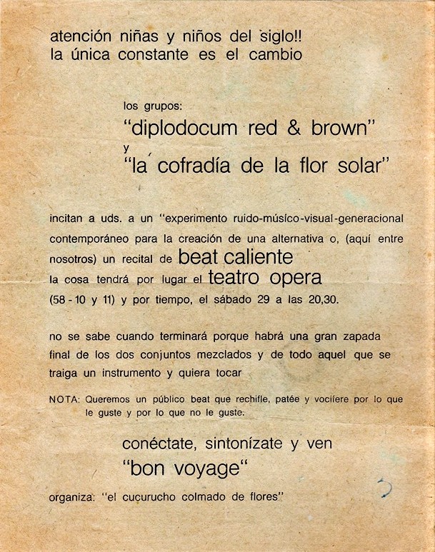 incitan a uds. a un «experimento ruido-músico-visual-generacional contemporáneo para la creación de una alternativa» o, (aquí entre nosotros) un recital de beat caliente la cosa tendrá por lugar el teatro ópera (58 – 10 y 11) y por tiempo, el sábado 29 a las 20,30. no se sabe cuando terminará porque habrá una gran zapada final de los dos conjuntos mezclados y de todo aquel que se traiga un instrumento y quiera tocar NOTA: Queremos un público beat que rechifle, patée y vocifere por lo que le guste y por lo que no le guste.