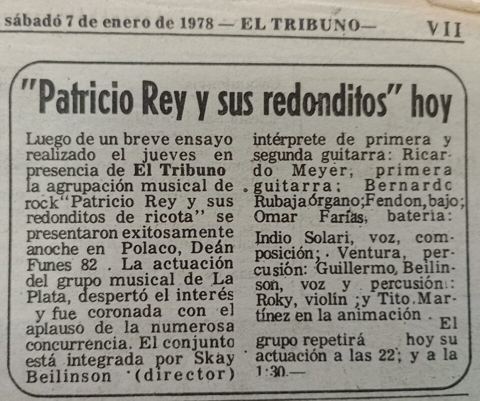 Luego de un breve ensayo realizado el jueves en presencia de El Tribuno, la agrupación musical de rock «Patricio Rey y sus Redonditos de Ricota» se presentaron exitosamente anoche en Polaco, Dean Funes 82. La actuación del grupo musical de La Plata, despertó el interés y fue coronada con el aplauso de la numerosa concurrencia. El conjunto está integrada por Skay Beilinson (director) intérprete de primera y segunda guitarra; Ricardo Meyer, primera guitarra; Bernardo Rubaja: órgano; Fendon, bajo; Omar Farías: batería; Indio Solari: voz, composición; Ventura: percusión; Guillermo Beilinson: voz y percusión; Roky: violín: y Tito Martínez en la anumación.