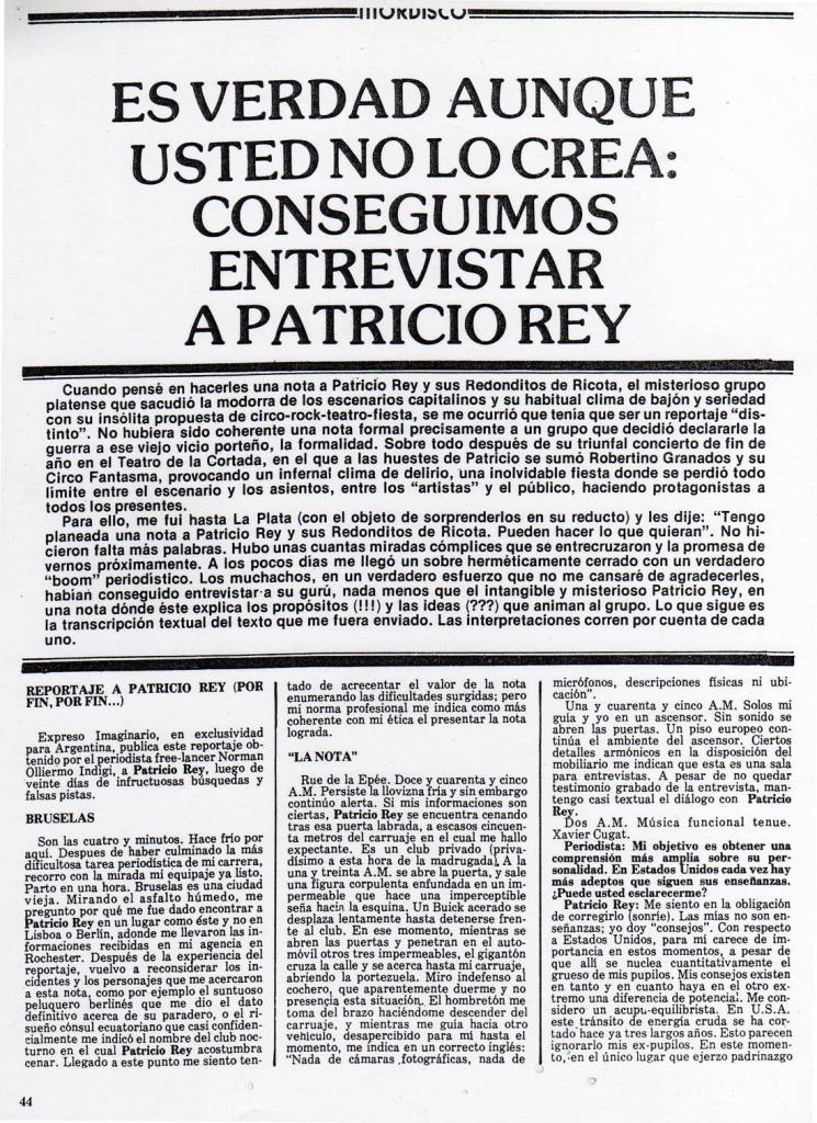 Para ello, me fui hasta La Plata (con el objeto de sorprenderlos en su reducto) y les dije: “Tengo planeada una nota a Patricio Rey y sus Redonditos de Ricota. Pueden hacer lo que quieran”. No hicieron falta más palabras. Hubo unas cuantas miradas cómplices que se entrecruzaron y la promesa de vernos próximamente. A los pocos días me llegó un sobre herméticamente cerrado con un verdadero «boom” periodístico. Los muchachos, en un verdadero esfuerzo que no me cansaré de agradecerles, habían conseguido entrevistar a su gurú, nada menos que el intangible y misterioso Patricio Rey, en una nota donde éste explica los propósitos (!!!) y las ideas (???) que animan al grupo. Lo que sigue es la trascripción textual del texto que me fuera enviado. Las interpretaciones corren por cuenta de cada uno.