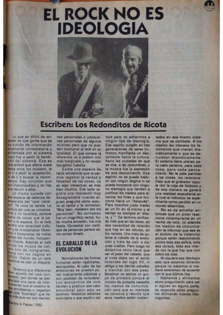 Normalmente las formas humanas están rigidizadas, acorazadas. Al calor de las emociones se pueden poner nuevamente plásticas y son posibles de remodelar. Los encuentros de rock tienden a producir ese calor emocional, pero esto es azaroso. Nosotros estamos sucriptos a ese espíritu del rock, pero no adherimos a ningún tipo de ideología. Ese espíritu surgido en tres generaciones de seres humanos manifiesta un descontento hacia la cultura, hacia las ciudades en que se vive, a las costumbres, y la música fué la expresión de ese descontento. Ese espíritu no se puede traducir en ningún dogma ni se puede incorporar con ninguna ideología, que tienden a justificar los medios para alcanzar los fines y que funciona hacia un «después». Para nosotros cada medio es un fin en sí mismo y el tiempo es siempre «ahora». Se termina confiando más que en las ideas, en esa necesidad de relación que hay en las células, en los nervios.
