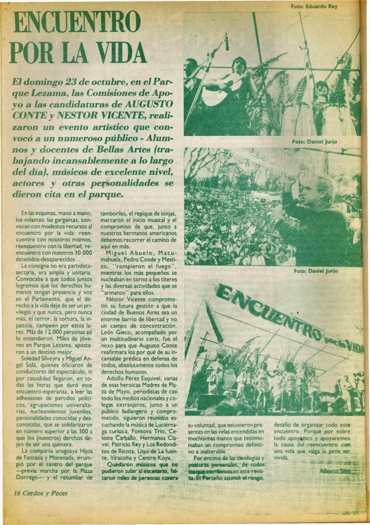 Adolfo Pérez Esquivel, varias de esas heroicas Madres de Plaza de Mayo, periodistas de casi todos los medios nacionales y colegas extranjeros, junto a un público bullangero y comprometido, siguieron reunidos escuchando la música de Luciérnaga curiosa, Fontova Trío, Celeste Carballo, Hermanos Clavel, Patricio Rey y los Redonditos de Ricota, Uqui de la Fuente, Viracocha y Centro Koya.