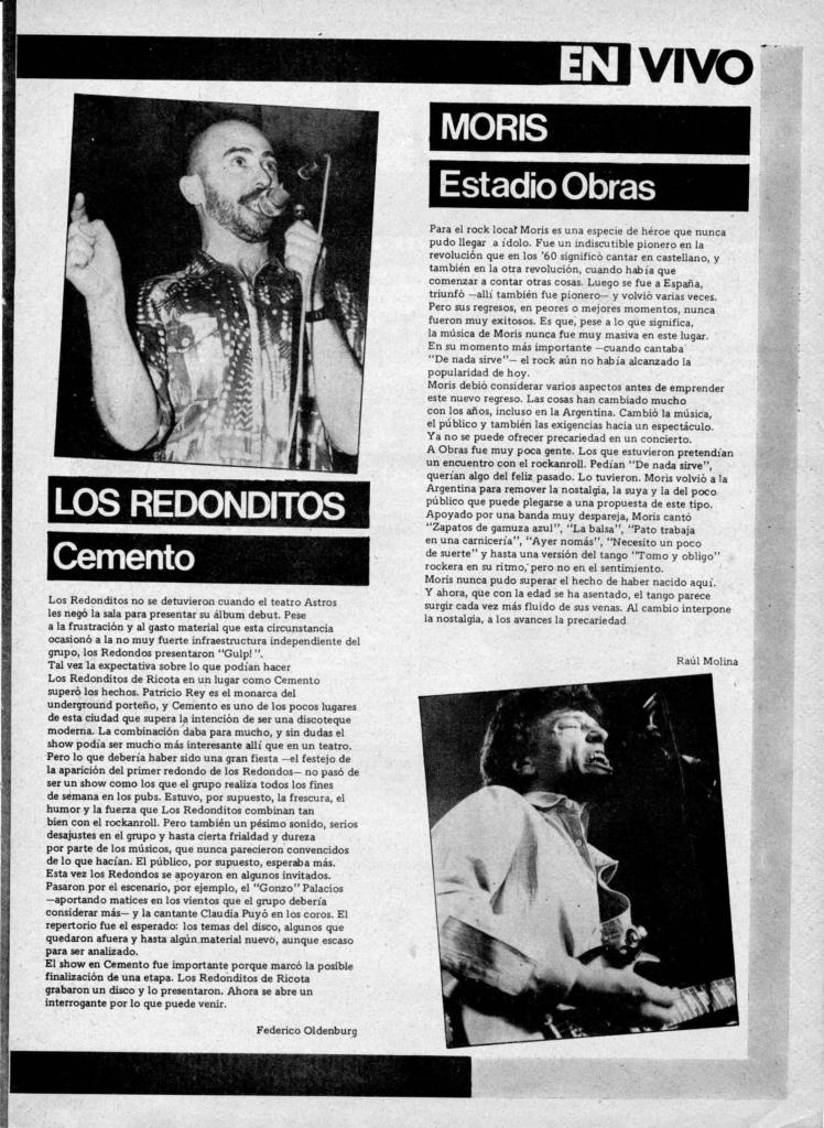 Pero lo que debería haber sido una fiesta -el festejo de la aparición del primer redondo de Los Redondos- no pasó de ser un show como los que el grupo realiza todos los fines de semana en los pubs. Estuvo, por supuesto, la frescura, el humor y la fuerza que los Redonditos combinan tan bien con el rocanroll. Pero también un pésimo sonido, serios desajustes en el grupo y hasta cierta frialdad y dureza por parte de los músicos, que nunca parecieron convencidos de lo que hacían.El público, por supuesto, esperaba más. Esta vez los Redondos se apoyaron en algunos invitados. Pasaron por el escenario,m por ejemplo, el «Gonzo» Palacios -aportando matices en los vientos que el grupo debería considerar más- y la cantante Claudia Puyó en los coros. El repertorio fue el esperado: los temas del disco, algunos que se quedaron afuera y hasta algún material nuevo, aunque escaso para ser analizado.