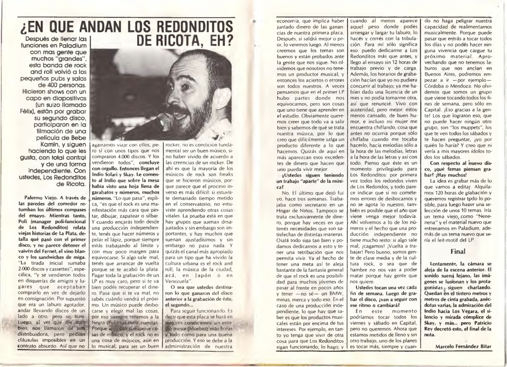 «La tirada inicial sumaba 2000 discos y casettes», especifica, «y se vendieron todos en disquerías de amigos y lugares que aceptaban comprarlo en vez de dejarlo en consignación. Por supuesto que era un laburo agotador andar llevando discos de un lado a otro, pero se hizo. Luego, al ver que iba muy bien, nos llamaron de una distribuidora, pero pedían cláusulas imposibles en un contrato absurdo. Así que no agarramos viaje con ellos, pero sí con unos tipos que nos compraron 4000 discos. Y los vendieron todos», concluye con orgullo. Entonces llegan el Indio Solari y Skay. Le comento al Indio que sobre la mesa había visto una hoja llena de garabatos y números, muchos números. «Lo que pasa, explica, «es que el rock es una manifestación más cara que pintar, dibujar, zapatear o silbar. Y cuando encaras todo desde una producción independiente, tenés que hacer números y pelar el lápiz, porque siempre estás trabajando al límite y con muy poco margen para equivocarse. Si algo sale mal, tenés que arrancar de vuelta porque se te acabó la plata. Pagar toda la grabación de un LP es muy caro, pero si te va bien podes recuperar el dinero. Pasa que si te va mal, no sabés cuándo vendrá el próximo. Un músico puede desbocarse y elegir mal las cosas, por eso siempre tenemos a la Negra (Poly) sacando cuentas. Porque un músico resuelve cosas de músico, y el rock no es una cosa de músicos, aún en lo musical; para ser un buen rocker no es condición fundamental ser un buen músico, sino haber vivido de acuerdo a las creencias de un rocker. De ahí es que la mayoría de los músicos de rock son freaks que se hicieron músicos, porque parece que el proceso inverso es más difícil: si estuviste demasiado tiempo metido en el conservatorio, no estuviste aprendiendo otras cosas vitales. La prueba está en que hay grupos que suenan desajustados y sin embargo son importantes, y hay muchos que suenan ajustadísimos y sin embargo no pasa nada. Y quizás el canal más apropiado para un tipo que ha vivido la cultura urbana es el rock and roll, la música de la ciudad, acá, en Japón o en Venezuela».