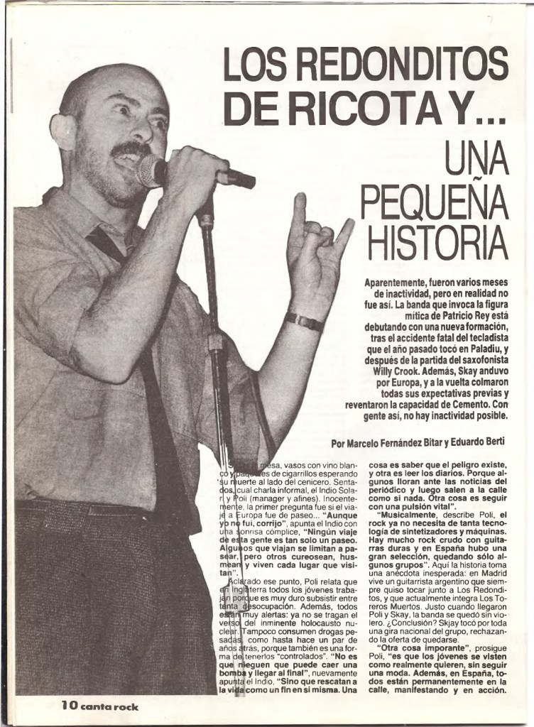 «Musicalmente, describe Poli, el rock ya no necesita de tanta tecnología de sintetizadores y máquinas. hay mucho rock crudo con guitarras duras y en España hubo una gran selección, quedando solo algunos grupos». Aquí la historia toma una anécdota inesperada: en Madrid vive un guitarrista argentino que siempre quiso tocar junto a Los Redonditos, y que actualmente integra Los Toreros Muertos. Justo cuando llegaron Poli y Skay, la banda se quedó sin violero. ¿Conclusión? Skay tocó por toda una gira nacional del grupo, rechazando la oferta de quedarse.