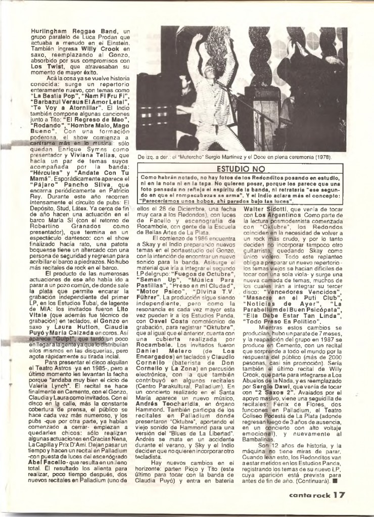 Son 2 años de historia y la máquina no tiene muras de parar. Cuando lean esto, Los Redonditos van a estar metidos en los Estudios Panda, registrando los temas de su nuevo LP, cuya aparición está prevista para antes de fin de año. (Continuará).