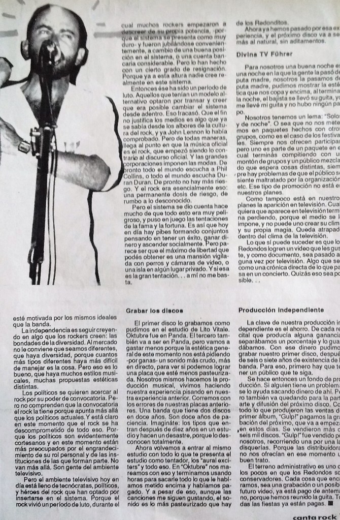 Ahora volvemos a entrar al mismo estudio con todo lo que te presenta el estudio como tentados, los «aural exciters» y todo eso. En Oktubre nos mareamos con eso y terminamos usando horas para sacarle todo lo que le habíamos metido encima y habíamos pagado. Y a pesar de eso, aunque las canciones me siguen gustando, el sonido es lo más pasteurizado que hay de los Redonditos.
