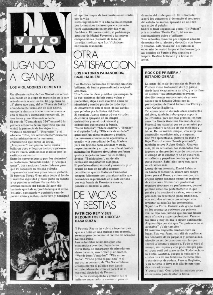 Los Redonditos, aclamados por una estruendosa ovación, digna de un River-Boca, se encargaron de ofrendar un show caliente, anecdótico y sin baches. «Vencedores vencidos», «Ella es tan linda», «Todo preso es político» y el particular cencerro de «la vaca cubana» enloquecieron al público que danzó entretenidamente sobre el parket de la eventual Sociedad de Fomento.