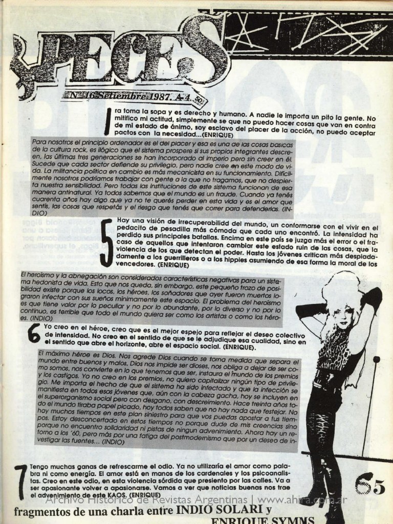 INDIO: El máximo héroe es Dios. Nos agrede Dios cuando se torna medida que separa el mundo entre buenos y malos, Dios nos impide ser dioses, nos obliga a dejar de ser como somos, nos convierte en lo que tenemos que ser, instaura el mundo de los premios y los castigos. Yo no creo en los premios, no quiero capitalizar ningún tipo de privilegio. Me importa el hecho de que el sistema ha sido infectado y que la infección se manifiesta en todos esos jóvenes que, aún con la cabeza gacha, hoy se incluyen en el superorganismo social pero con desgano, con descreimiento. Hace treinta años todo el mundo tiraba papel picado, hoy todos saben que no hay nada que festejar. No hay muchos tiempos en este plan siniestro para que vos puedas apostar a tus tiempos. Estoy desconcertado en estos tiempos no porque dude de mis creencias sino porque no encuentro solidaridad ni pistas de ningún advenimiento. Ahora hay un retorno a los ´60, pero más por una fatiga del postmodernismo que por un deseo de investigar las fuentes…