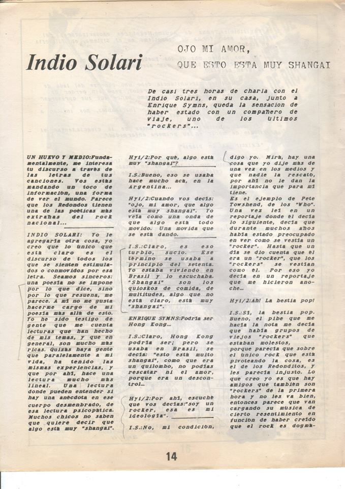 Entrevista de Enrique Symns a Indio Solari. Revista Fin de Siglo.11/ 1987. Está incompleta