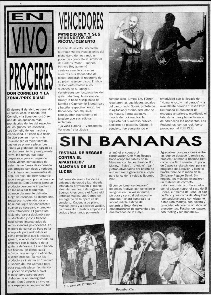 El éxito de acierto fino colmó nuevamente las instalaciones del nicho dark, demostrando un poder de convocatoria similar al de Carlitos «Mona» Jiménez. Patricio Rey aumentó cautelosamente sus arcas mientras sus Redonditos de Ricota atesoran el repertorio de su próximo tercero disco. El show de Cemento mostró a los duendes en su apogeo. Vertebrados por los destellos del guitarrista Skay, la escena de Dawi y la base disciplinada de Semilla y Capricornio Sidotti (bajo y batería, respectivamente), los Redondos, con alquimia, consiguieron nuevamente el jengibre que sus adictos reclaman,