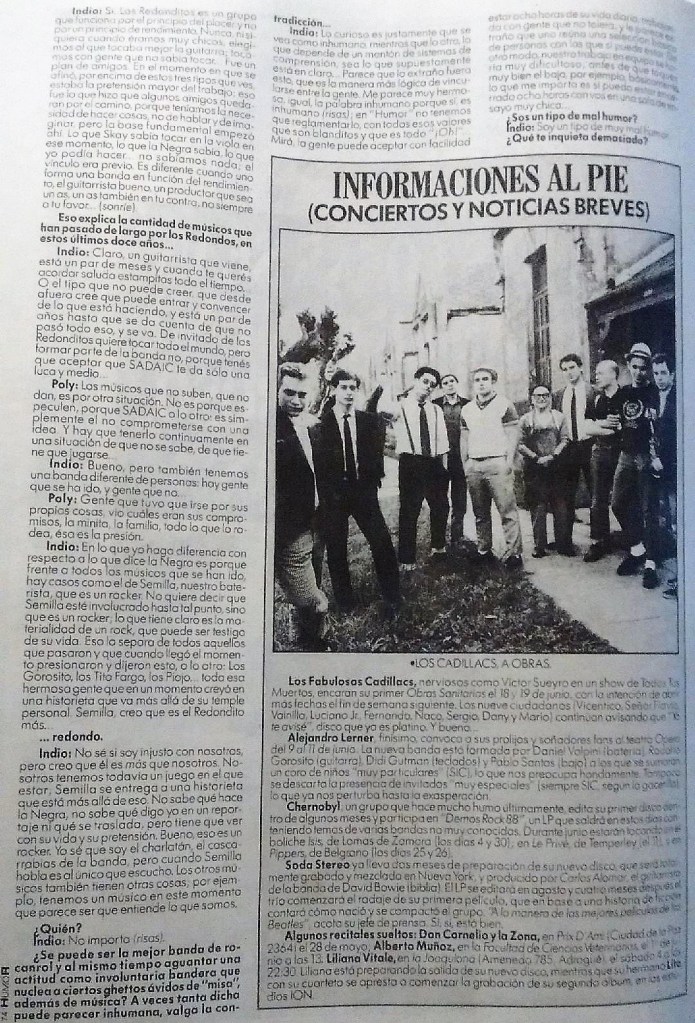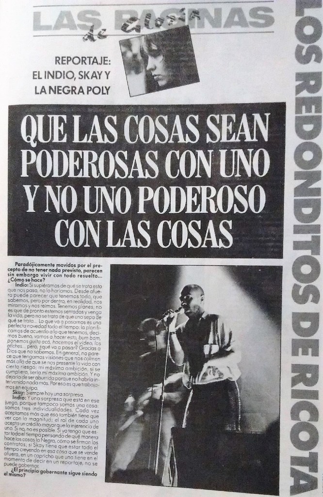 Indio: Si, los Redonditos es un grupo que funciona por el principio del placer y no por un principio de rendimiento. Nunca, ni siquiera cuando éramos muy chicos, elegimos al que tocaba mejor la guitarra; tocamos con gente que no sabía tocar. Fue un plan de amigos. En el momento en que se afinó, por encima de estos tres tipos que ves, estaba la pretensión mayor del trabajo; eso fue lo que hizo que algunos amigos quedaran por el camino, porque teníamos la necesidad de hacer cosas, no de hablar y de imaginar, pero la base fundamental empezó ahí. Lo que Skay sabía tocar en la viola en ese momento, lo que la Negra sabía, lo que yo podía hacer… no sabíamos nada, el vínculo era previo. Es diferente cuando uno forma una banda en función del rendimiento, el guitarrista bueno, un productor que sea un as… un as también en tu contra, no siempre a tu favor… (sonríe)