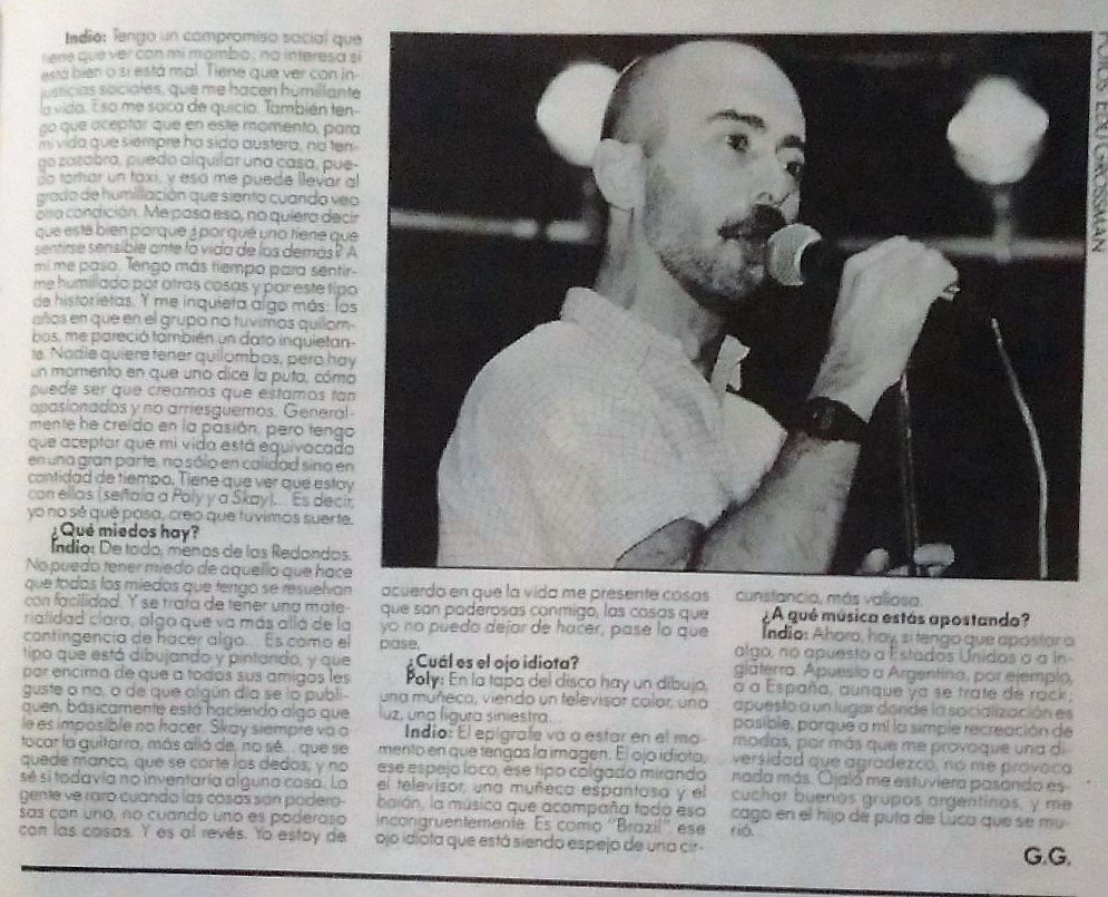 Indio: Ahora, hoy, si tengo que apostar a algo, no apuesto a Estados Unidos o a Inglaterra. Apuesto a Argentina, por ejemplo, o a España, aunque ya se trate de rock; apuesto a un lugar donde la socialización es posible, porque a mí la simple recreación de modas, por más que me provoque una diversidad que agradezco, no me provoca nada más. Ojalá me estuviera pasando escuchar buenos grupos argentinos y me cago en el hijo de puta de Luca que se murió.