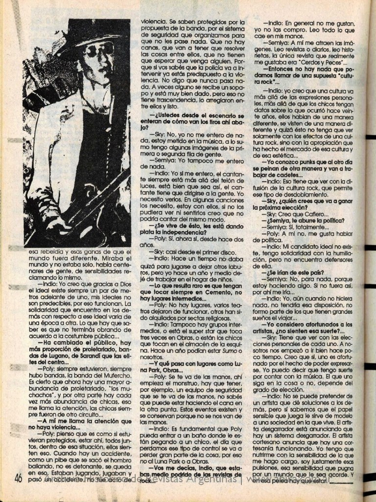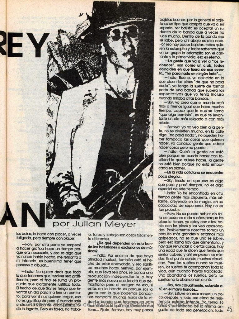 -Indio: No quiero decir que todo lo que tenemos que resolver sea gratificante, pero al final se suma un producto que claramente justifica todo. El hecho de que Skay se tenga que levantar un día para ir a leer un contrato, para ver si nos quieren cagar, no es gratificante, pero si cuando sale el disco. La salida del disco justifica todo lo ingrato. Pero es tarea, no trabajo. Tarea y trabajo son cosas totalmente diferentes.