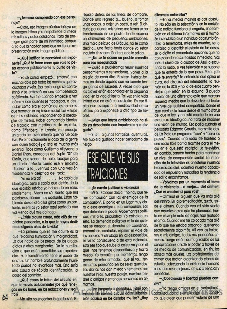 Yo se cómo empezó… empezó con mucha rabia por todas las mentiras que escuchaba y veía. Esa rabia luego se contaminó y se enfrascó en una competencia sofisticada. Eso fue cuando empecé a ver cómo y con quienes se trabajaba, a descubrir cómo era el común de los hombres que manejan la expresión social, Los vi lejos de mi sensibilidad, respondiendo a ideologías de miseria. Haber compartido ideales de trabajo con mediocres de espíritu, como Tiffenberg o Lanata me produjo un grado de resentimiento que no fue positivo. Pero no solamente el caso de la gente con quien trabajé; la lista es mucho más extensa. Tipos como Guillermo Alleyrand o Daniel Khon, creadores del Suple «Si» de Clarín, que siendo del palo, trabajan para un diario nefasto como ese y encima idiotizan a la juventud con una versión modernosa y aséptica del rock.