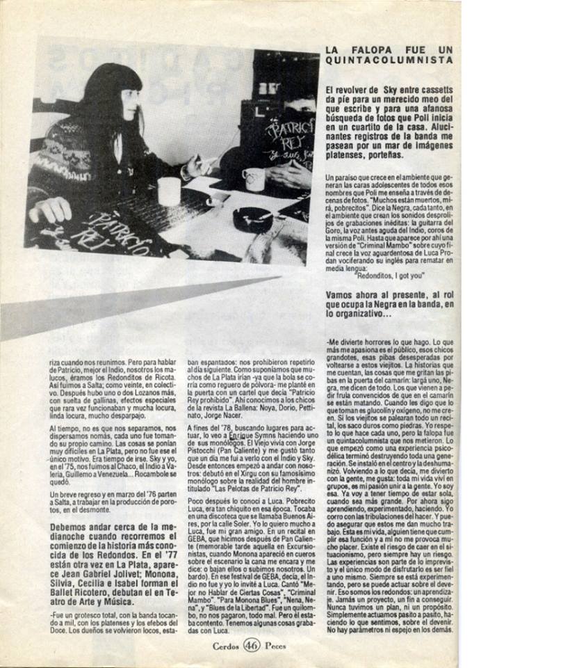 «Me divierte horrores lo que hago, Lo que más me apasiona es el público, esos chicos grandotes, esas pibas desesperadas por voltearse a estos viejitos, Las historias que me cuentan, las cosas que gritan las pibas en la puerta del camarín: largá uno, Negra, me dicen de todo. Los que vienen a pedir frula convencidos de que en el camarín se están matando. Cuando les digo que lo que toman es glucolin y oxígeno, no me creen. Si los viejitos se darían todo un recital los saco duros como piedras. (… -inentendible-) Lo que empezó como una experiencia psicodélica terminó destruyendo toda una generación (…-inentendible-) Volviendo a lo que decía, me divierto mucho con la gente, me gusta. Toda mi vida viví en grupos, es mi pasión unir a la gente. Yo soy esa. Ya voy a tener tiempo de estar sola, cuando sea más grande. Por ahora sigo aprendiendo, experimentando, haciendo. Yo corro con las tribulaciones deshacer. Y puedo asegurar queme dan mucho trabajo. Esta es mi vida, alguien tiene que cumplir esa función y a mi me provoca mucho placer. Existe el riesgo de caer en el situacionismo, pero siempre hay un riesgo. Las experiencias son parte de lo imprevisto y el unico modo de disfrutarlo es ser fiel a uno mismo. Siempre se está experimentando, pero se puede actuar sobre el devenir. Eso somos los Redondos: un aprendizaje. Jamás un proyecto, un fin a conseguir. Nunca tuvimos un plan, ni un propósito. Simplemente actuamos pasito a pasito, haciendo lo que sentimos sobre el devenir. No hay parámetro ni espejos en los demás».
