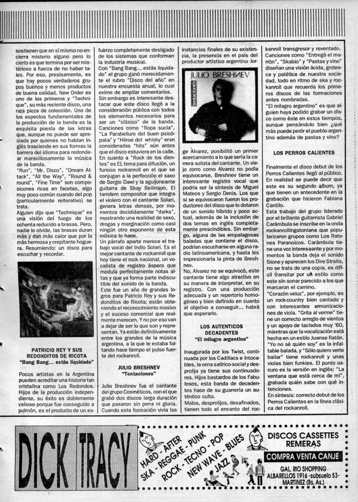 Este fue un año de grandes logros para Patricio Rey y sus Redonditos de Ricota; están obteniendo el reconocimiento masivo y el suceso comercial que realmente merecen. no por eso van a dejar de ser lo que son y representan. Ya están definitivamente entre los grandes del la música argentina, a la que le estaba faltando hace tiempo el pulso fuerte del rockanroll.