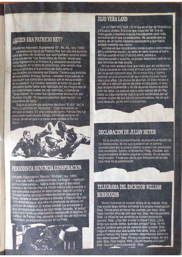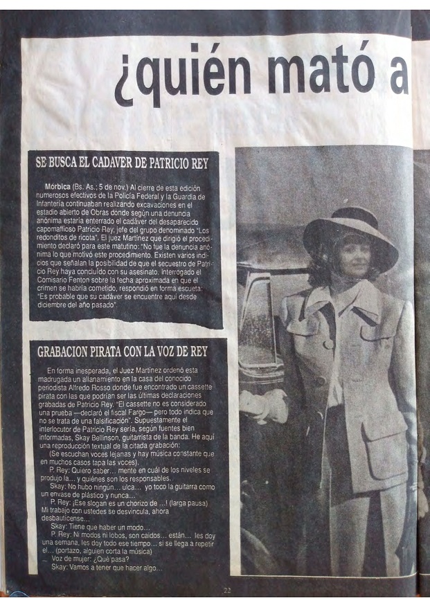 Mórbica (Bs As, 5 de noviembre). Al cierre de esta edición numerosos efectivo de la Policía Federal y la Guardia de Infantería continuaban realizando excavaciones en el estadio abierto de Obras donde según una denuncia anónima estaría enterrado el cadáver del desaparecido capomaffioso Patricio Rey, jefe del grupo denominado «Los redonditos de ricota». El juez Martínez que dirigió el procedimiento declaró para este matutino: «No fue la denuncia anónima lo que motivó este procedimiento. Existen varios indicios que señalan la posibilidad de que el secuestro de Patricio Rey haya concluido con su asesinato. Interrogado el Comisario Fenton sobre la fecha aproximada en que el crimen se habría cometido, respondió en forma escueta: «Es probable que su cadáver se encuentre aquí desde diciembre del año pasado».
