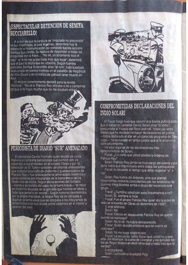 El periodista Carlos Polimeni quien desató de cierta manera la campaña periodística que culminó con los recientes procedimientos en el estadio Obras u con la detención de El Tano -pistolero de amplios antecedentes que cumplía la función de choferino y guardaespaldas de Patricio Rey- fue reiteradamente amenazado telefónica y personalmente por integrantes de la barra brava de los Redonditos de Ricota. Según declaraciones del Soldado -nombre de batalla del capo de la barra brava- «el mozo se insolentó después de la goleada que hicimos en Obras y hubo que ponerlo en vereda». Según rumores desmentidos por la propia implicada, la Negra Poly se vio obligada a duplicar la tarifa usual que se otorgaba a los integrantes de la barra brava en sus shows como visitantes en el interior o exterior del país.
