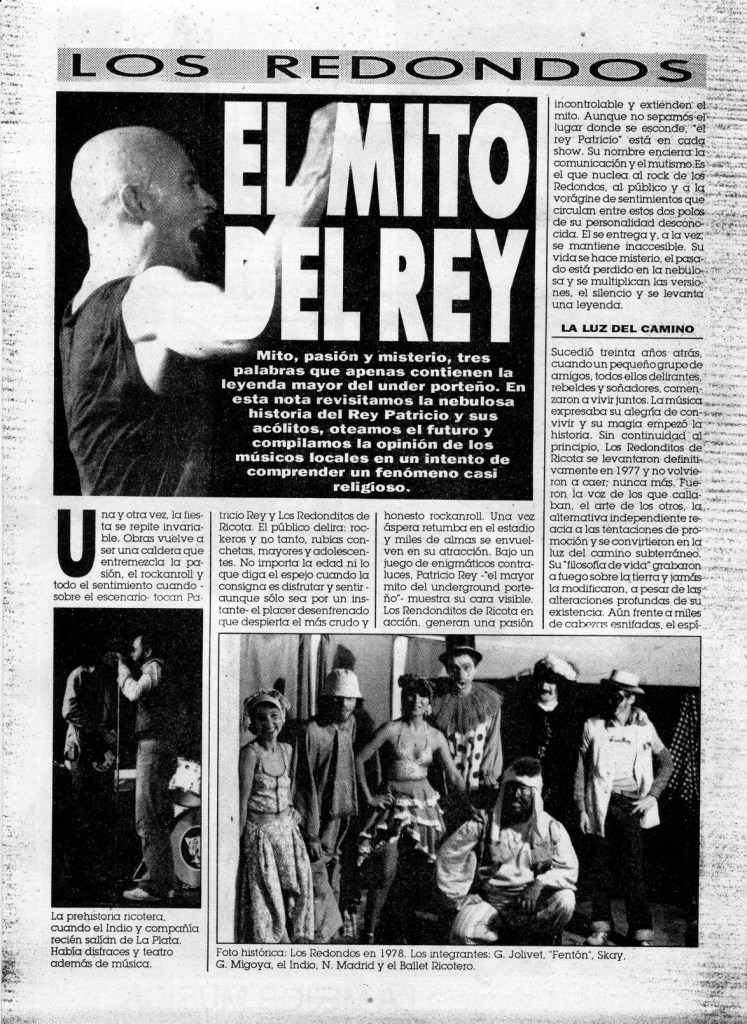 Los Rendonditos de Ricota en acción, generan una pasión incontrolable y extienden el mito. Aunque no sepamos el lugar donde se esconde, el rey Patricio está en cada show. Su nombre encierra la comunicación y el mutismo. Es el que nuclea al rock de los Redondos, al público y a Ia vorágine de sentimientos que circulan entre estos dos polos de su personalidad desconocida. Él se entrega y, a la vez, se mantiene inaccesible. Su vida se hace misterio, el pasado está perdido en la nebulosa y se multiplican las versiones, el silencio y se levanta una leyenda. Sucedió treinta años atrás, cuando un pequeño grupo de amigos, todos ellos delirantes, rebeldes y soñadores, comenzaron a vivir juntos. La música expresaba su alegra de convivir y su magia empezó la historia. Sin continuidad al principio, Los Redonditos de Ricota se levantaron definitivamente en 1977 y no volvieron a caer nunca más. Fueron la voz de los que callaban, el arte de los otros, la alterativa independiente reacia a las tentaciones de promoción y se convirtieron en la luz del camino subterráneo.
