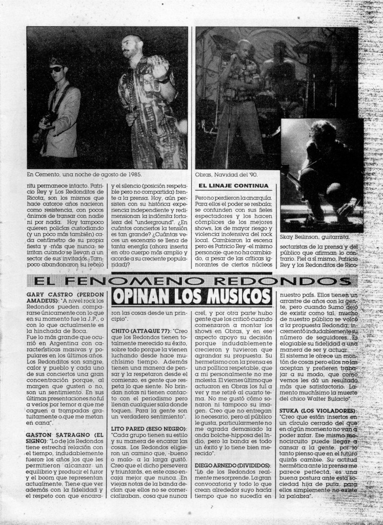 CHITO (ATTAQUE 77): «Creo que los Redondos tienen totalmente merecido su éxito, sobre todo porque la vienen luchando desde hace muchísimo tiempo. Además tienen una manera de pensar y la respetaron desde el comienzo, es gente que respeta lo que siente. No brindan notas ni tienen contacto con el periodismo pero llenan cualquier sala donde toquen. Para la gente son un verdadero sentimiento».