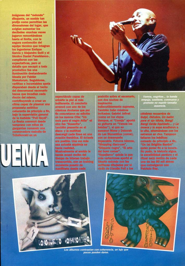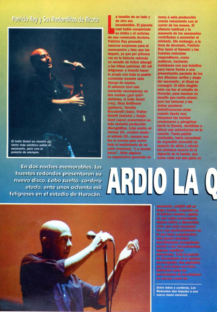 La expectativa generada en torno a esta producción crecía velozmente con el correr de los meses. El silencio habitual, y la ausencia de los escenarios contribuían a aumentar el misterio. Sin embargo, a la hora de develarlo, Patricio Rey lanzó el llamado y las huestes redondas respondieron, como pudieron, haciendo malabares con sus bolsillos para hacer frente a una presentación paralela de los dos álbumes -arriba y abajo del escenario-, el ritual se consagró. El sitio elegido esta vez fue el estadio de Huracán, para muchos un desafío que metía miedo; pero los temores y las dudas quedaron definitivamente atrás cuando desde muy temprano las bandas comenzaron a peregrinar hacia la Quema, decididas a ubicar sus estandartes en la cancha. Tanta pasión contenida, tanta necesidad de expresión encontró un espacio de alivio y reforzó los planteos acerca de la vigencia de la banda, que como cada vez que gana un escenario, exhibió allí su mejor sonido. Conocido es el folklore ricotero, sabido es que cada convocatoria depara delirio a discreción; claro que este encuentro tuvo sus particularidades en lo que hace a la producción: una puesta escénica sencillamente excepcional, acorde a las circunstancias, lograba equilibrar emociones.
