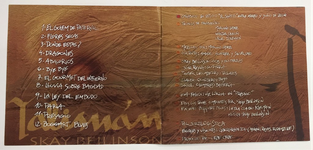«Vení, vamos a escucharlo», invita. El arte de tapa corresponde, como siempre, al artista plástico platense Rocambole: una caja y un sobre interno con dibujos inspirados en las letras, en clave de comic. Skay se hunde en el sillón, enciende un rubio y manda play desde el control. Lo primero que se escucha es una guitarra tocando un boogie y una voz de caverna: «Cerró sus ojos para no ver / tapó su boca para no hablar / apretó los puños por no gritar / guardó los sueños en el placard».