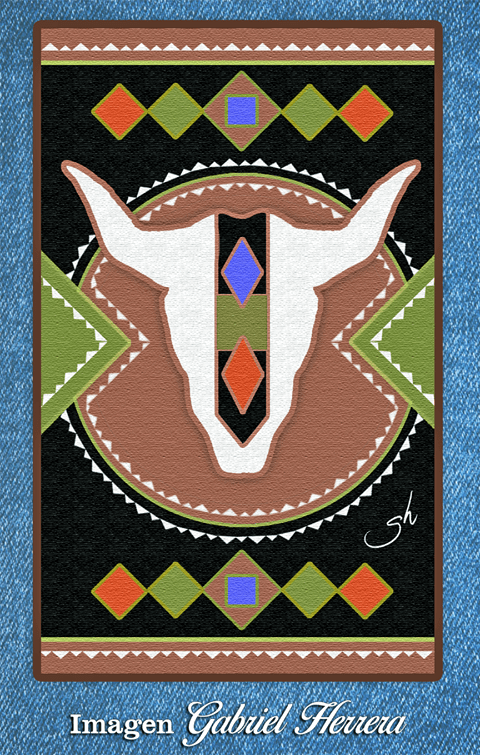De uno de los bolsillos (que también está bordado) cuelgan dos tiras de cuero con cuentas de colores. Una verdadera obra de arte!!El artista gráfico Gabriel Herrera recreó con su computadora el parche que aparece en la pierna derecha del jean del Indio, y quedó buenísimo!! Les compartimos la imagen para que todos puedan disfrutar los detalles de su trabajo, que replican casi a la perfección el diseño.