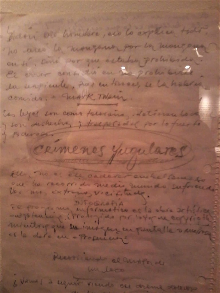 Entre los manuscritos que se expusieron nos llamó la atención uno titulado «Crímenes yugulares», que apareció junto a las letras de sus principales canciones ricoteras. La inclusión de ese texto entre los manuscritos quizá obedezca a un error, porque no es específicamente la letra de un tema, sino un conjunto de pensamientos y referencias que, como veremos a continuación, seguramente lo inspiraron para componer alguna canción, para titularla, o para agregarle alguna idea.
