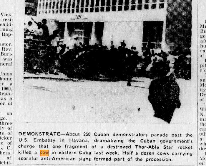 La anécdota de Tenet fue real: casi una semana después de la caída del cohete, el 6 de diciembre de 1960, se publicó en un diario de EEUU una noticia que da cuenta de una especie de «desfile» que a modo de protesta realizaron 250 cubanos frente a la embajada yanky en La Habana, escandalizados por la muerte de una vaca en el oeste cubano. Participaron de repudio media docena de vacas «que llevaban señales anti americanas», según puede leerse en el artículo (6).
