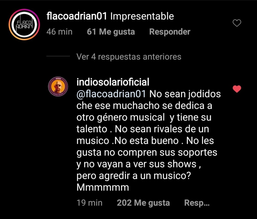 El Indio Solari no dudó en dar su opinión respecto de ese tipo de agresión: “No sean jodidos che, ese muchacho se dedica a otro género musical y tiene su talento. No sean rivales de un músico, no está bueno. Si no les gusta no compren sus soportes y no vayan a ver shows ¿pero agredir a un músico?, mmm”.
