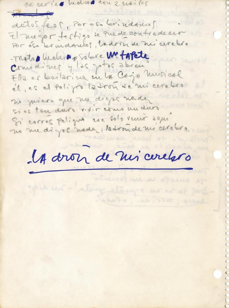 Durante la exposición que brindó en el año 2015 en la Biblioteca Nacional, Indio Solari por primera vez mostró algunos de los manuscritos originales de sus letras. Son tesoros invaluables que nos permiten descubrir el proceso creativo, y algunas de las modificaciones que les realizó a las canciones.