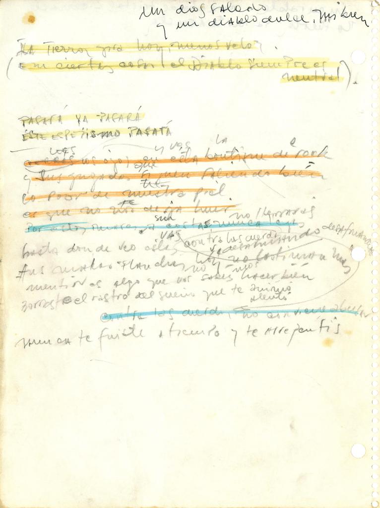 En el manuscrito puede verse que la letra sufrió algunas modificaciones. Por ejemplo en este documento el Indio escribió: «Lo peor de tu piel es que no te deja huir», pero en el disco finalmente cantó: «Lo mejor de nuestra piel es que no nos deja huir».