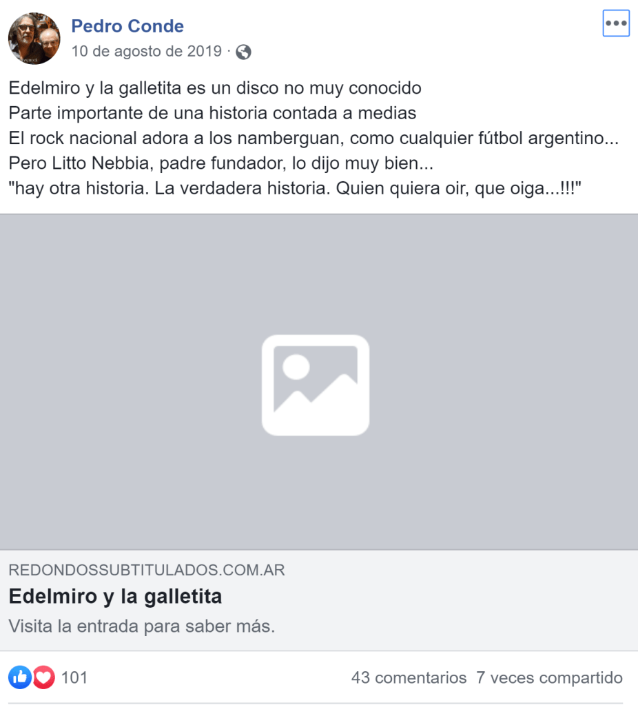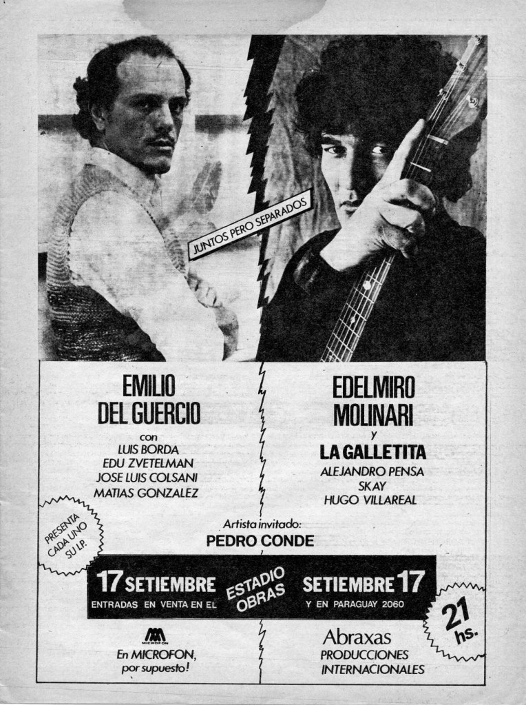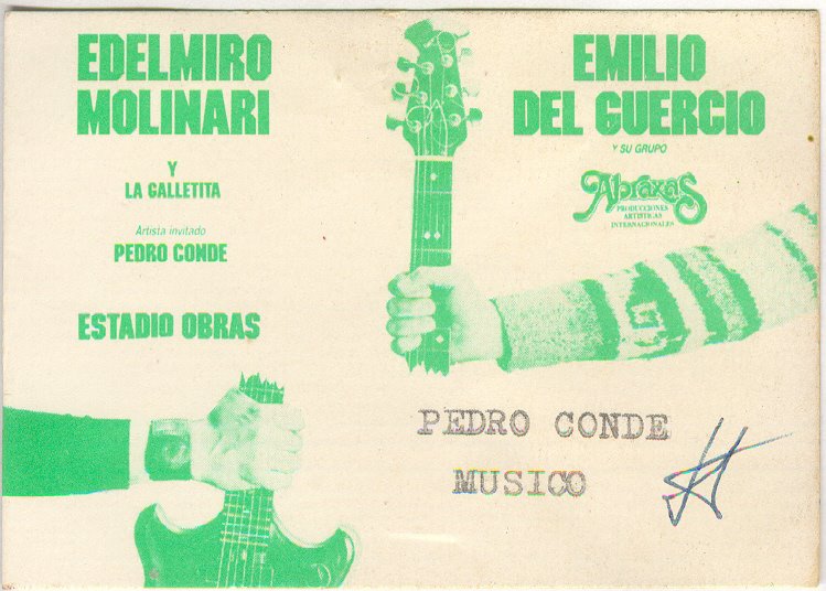 Pedro Conde: «Después de BA Rock muchas compañías me ofrecieron contrato de grabación. Yo era nuevo, completamente desconocido, llevaba apenas seis meses de carrera. Teloneaba a Piero y a Pedro y Pablo y pertenecía al staff de La Corporación, la agencia de Oscar López y el gordo Pierre Bayona. Pero me quedé con Edelmiro porque no me cargoseó: me invitó a almorzar y me preguntó simplemente si quería grabar».