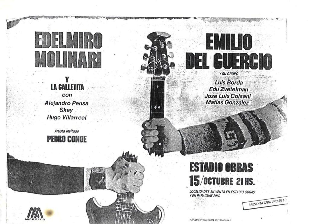 El grupo se presentó en el Estadio Obras el 15 de octubre de 1983. Esa noche formaron parte de «Edelmiro y la galletita» Edelmiro, Skay, Pensa y Hugo Villareal.