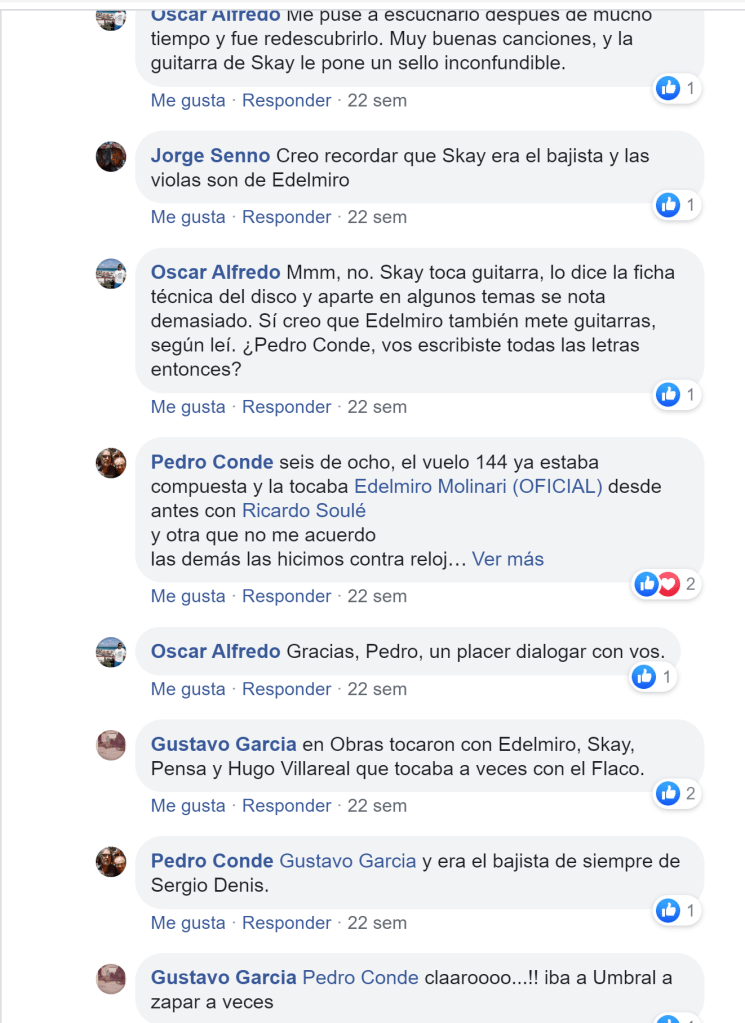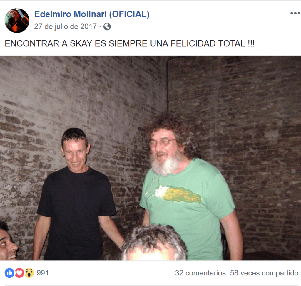 Edelmiro Molinari: «Fue un momento muy duro. El día antes de llegar estaba mirando la tele en los Estados Unidos y me enteré de que la Argentina invadía las Malvinas. ¡No lo podía creer! La situación era increíble. Los militares sólo querían usar al rock. Y las compañías te grababan un disco, lo editaban cuando querían y después lo enterraban. «¿Qué querés que hagamos? Estamos en guerra», te decían. Con Skay teníamos una química muy especial. Yo lo admiro porque es el guitarrista más original de la Argentina. Toca dos notas y te das cuenta de que es él. Incluso en aquella época» Edelmiro Molinari, Rolling Stone, octubre de 2006