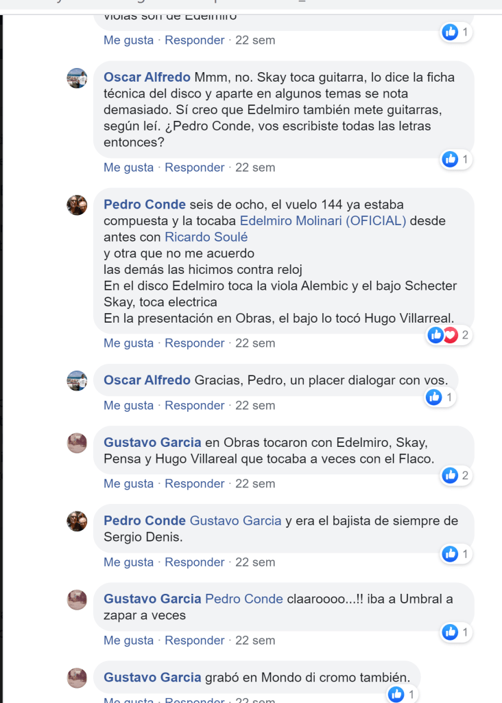 En su página de Facebook Conde contó que «en el disco Edelmiro toca la viola Alembic y el bajo Schecter. Skay, toca eléctrica. En la presentación en Obras, el bajo lo tocó Hugo Villarreal».