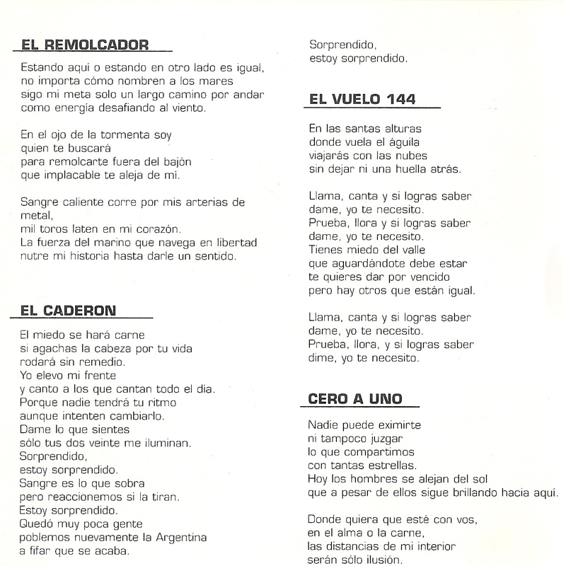 Molinari le hizo caso. Pistocchi, cerebro lúcido, creador del Expreso Imaginario y de Pan Caliente, intentó escribir las letras pero no llegó a buen puerto. Las miradas se depositaron entonces en ese chico de 20 años que había impactado en el BA Rock.